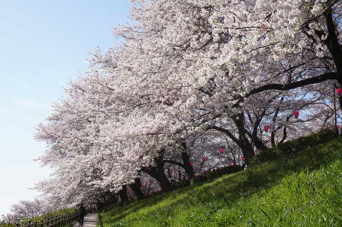 時折ふく風で、早咲きの桜の木ではハラハラと花びらが舞い散ります。全長約1kmの堤の上を歩くとそこから見える周りの景色や満開でボリュームのある桜のトンネルと舞い散る花びらをお楽しみいただけます。
