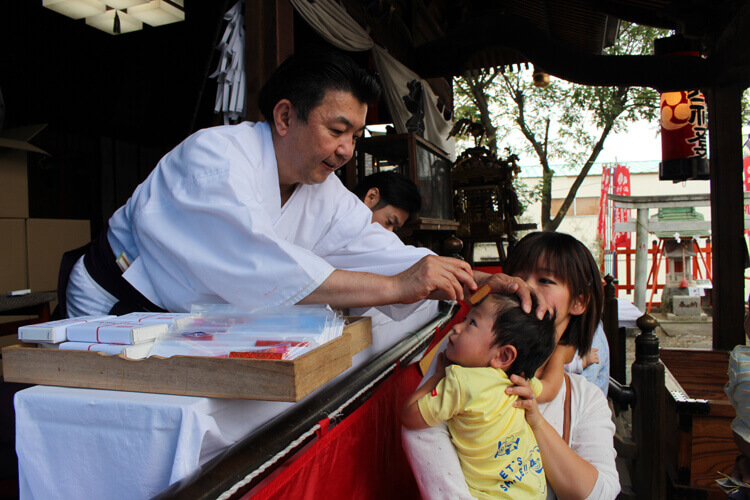 赤ちゃんが「初めて山に登る」ことから、その名前が付けられたといわれるこの行事では、その年に生まれた赤ちゃんのおでこに赤い神社印(前述した富士山信仰にちなんで富士山が彫り込まれている。)を押して、その健やかな成長を祈ります。