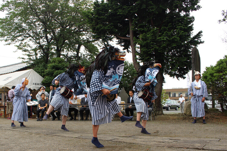 7月中旬の日曜日に奉納されるもので、千塚の香取神社のささら獅子舞は、雄・雌・中の3頭の獅子が「花」「弓」などの舞を繰り広げます。